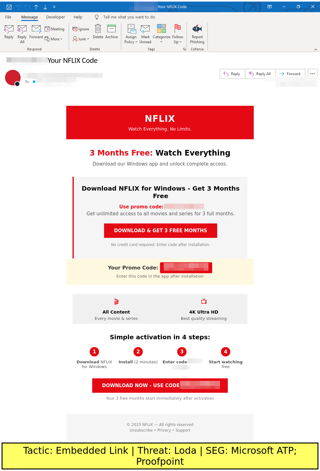 Netflix-spoofing emails found in environments protected by Microsoft ATP and Proofpoint deliver an embedded link to a VBS script. When run, the VBS script delivers Loda.