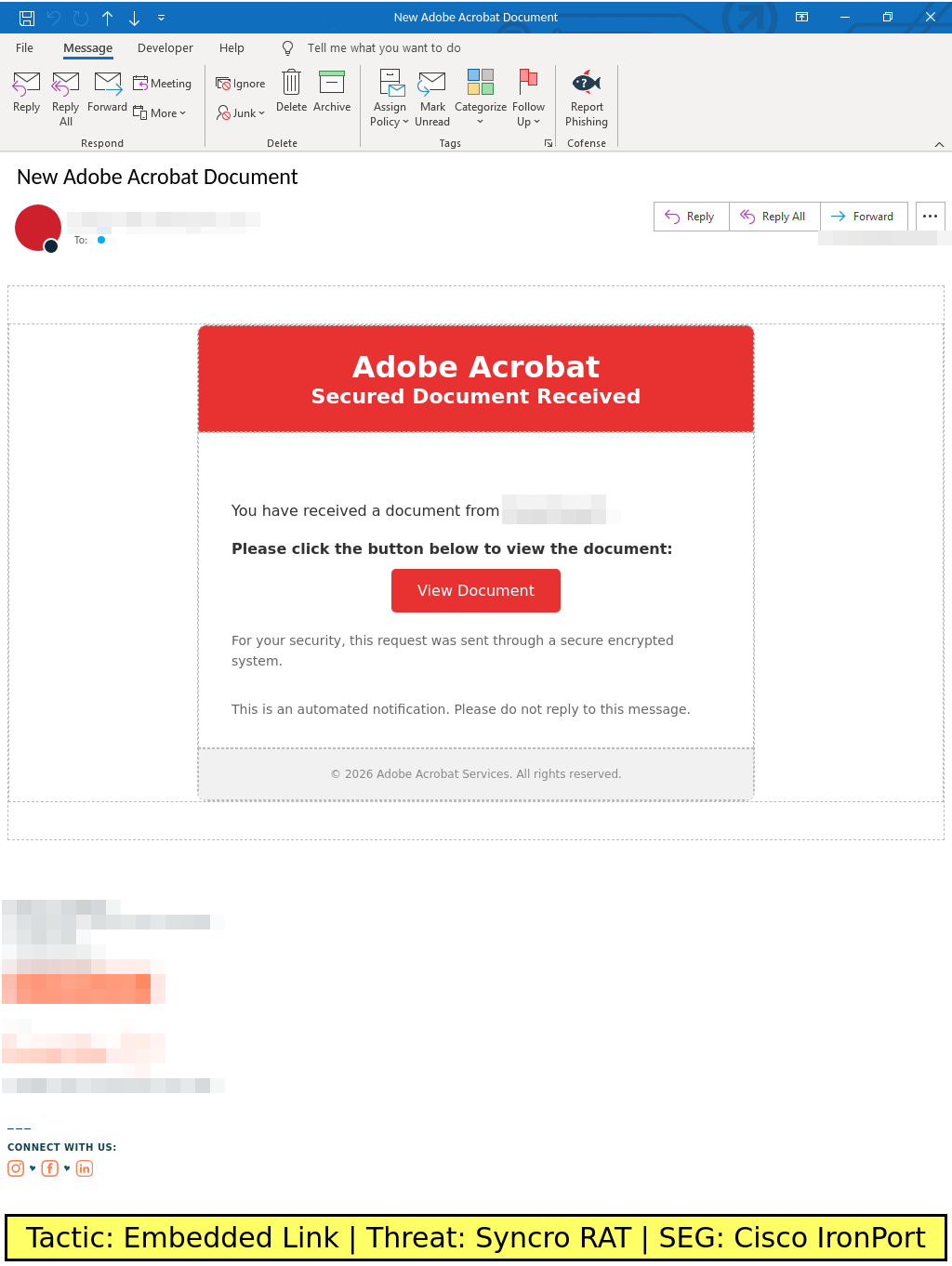 Adobe-spoofing emails found in environments protected by Cisco IronPort deliver Syncro RAT via an embedded URL.