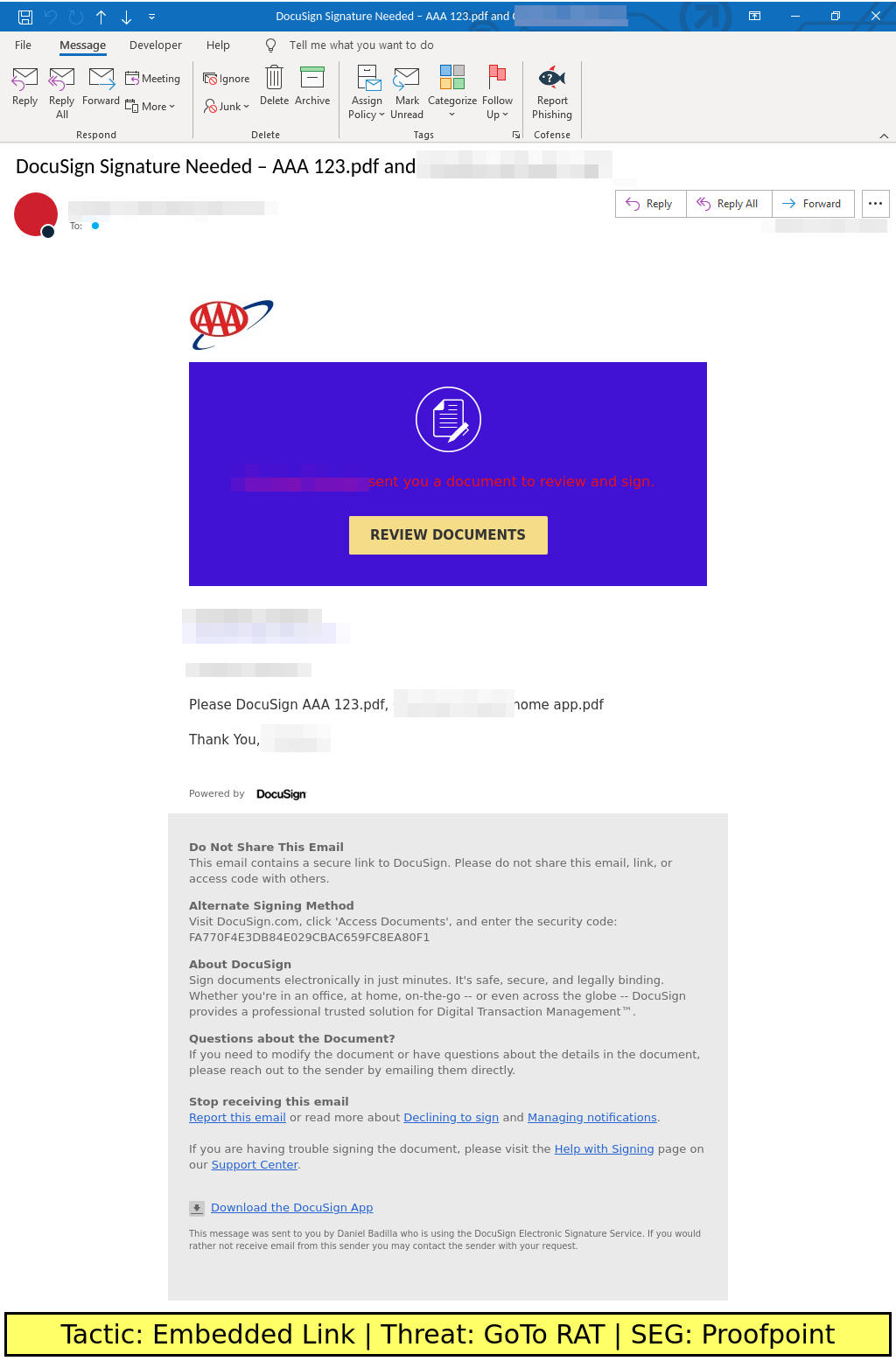 Docusign-spoofing emails found in environments protected by Proofpoint deliver GoTo RAT or Credential Phishing via an embedded URL.