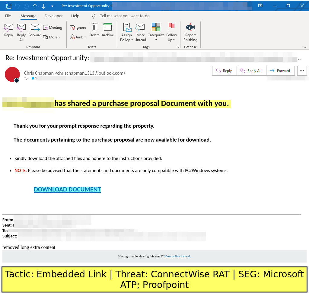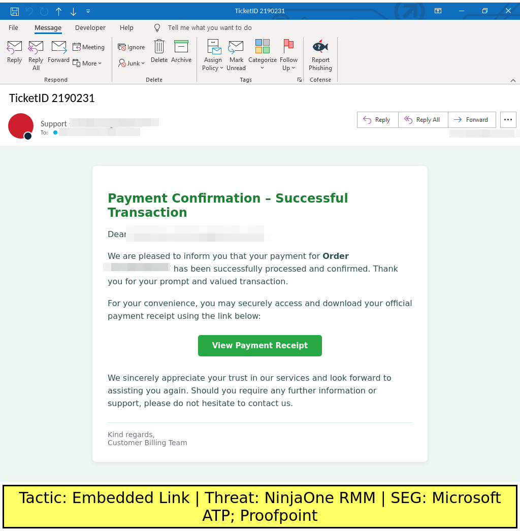 Finance-themed emails found in environments protected by Proofpoint and Microsoft ATP deliver an embedded link to download NinjaOne RMM.