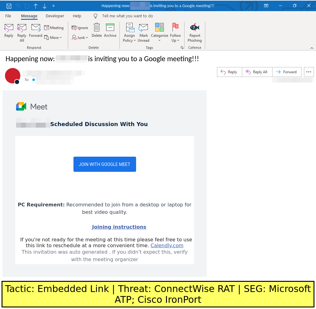 Google Meet-spoofing campaign found in environments protected by Microsoft ATP and Cisco IronPort delivers Itarian RAT via an embedded URL. Itarian RAT delivers a ConnectWise RAT sample.