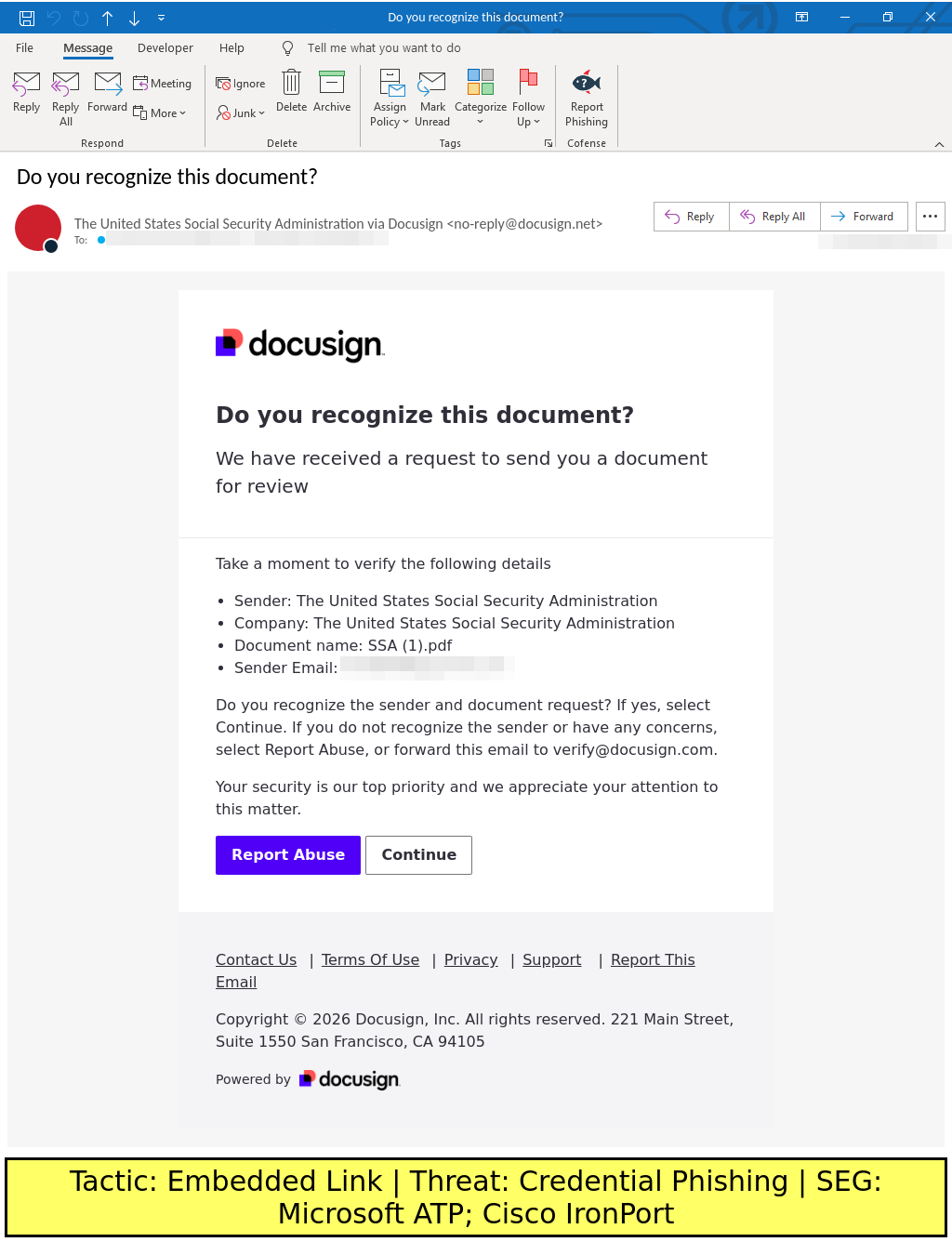 Social Security Administration and Docusign-spoofing campaign found in environments protected by Microsoft ATP and Cisco IronPort delivers Credential Phishing via an embedded URL which leads to a QR code.