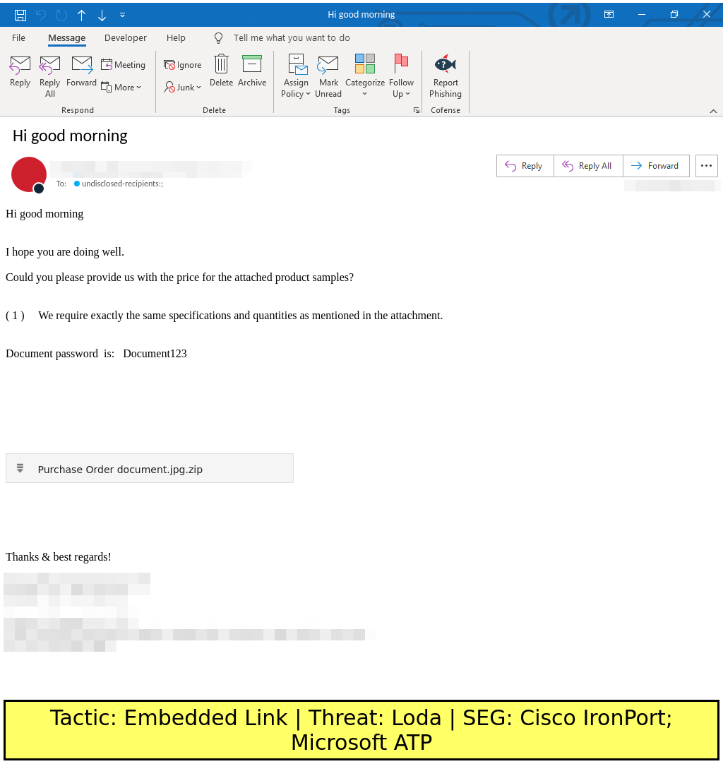 Document-themed emails found in environments protected by Cisco IronPort and Microsoft ATP deliver a password protected archive containing a VBS script via an embedded URL. The VBS script delivers Loda.